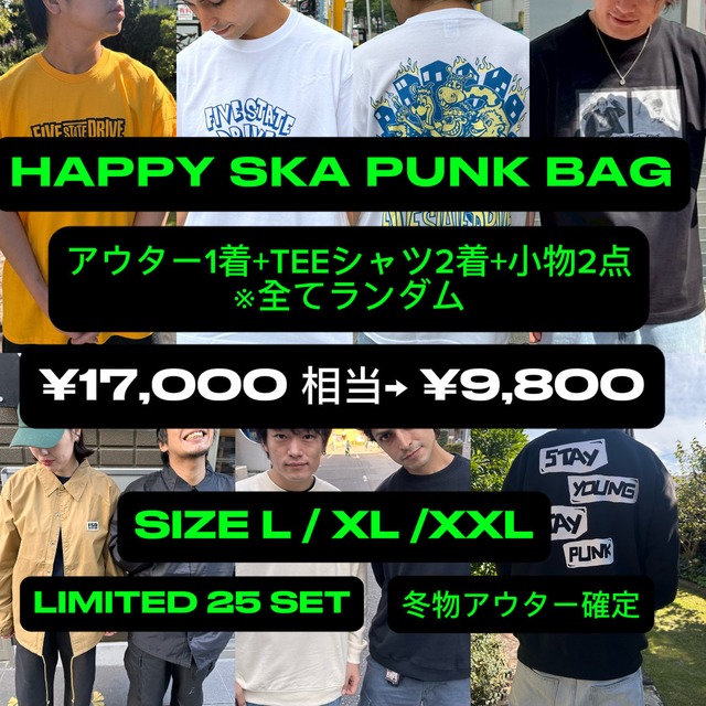 HAPPY SKA PUNK BAG 【25セット限定】 ¥17,000相当 → ¥9,800 アウター入りの超お得セットを数量限定で販売します。 ⸻ ■ 内容 ・冬物アウター 1着(確定) ・Tシャツ 2着 ・小物 2点 ※デザインは全てランダムになります 合計 ¥17,000相当が → ¥9,800(税込) 正直かなり攻めた価格です。 ⸻ ■ サイズ L / XL / XXL ※アウター・Tシャツすべて同サイズでお届けします。 ⸻ ■ 注意事項 ・数量限定25セット(無くなり次第終了) ・ランダム封入のため、デザイン指定不可だが希望がある方は要望に書いてください。 ・返品・交換は出来ませんのでご了承ください ⸻ 冬物アウターが確定で入ってこの価格は今回限り。 在庫が動いたら終了です。 迷ってる間に無くなる可能性あります。 無くなる前にどうぞ